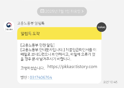 다음날인 2025년 07월 01일 고용도동부 알림톡이 도착했습니다.