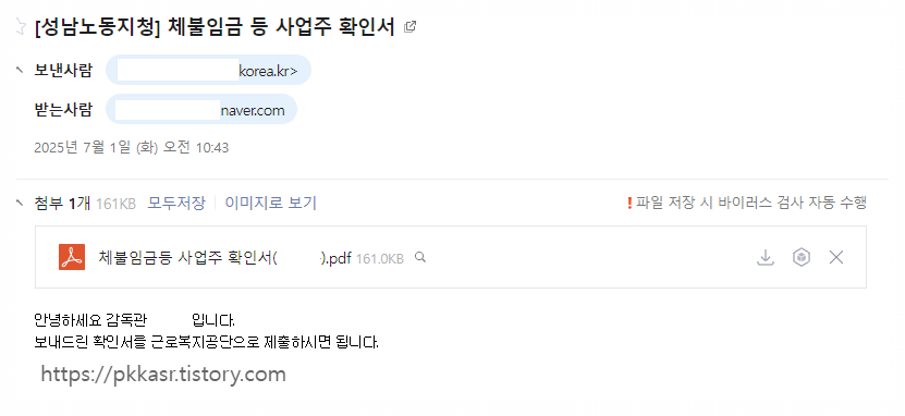 메일을 확인해보니 근로감독관님이 체불임금 확인서를 PDF파일로 보내주셨어요.